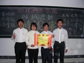 12月7日下午,物理学院06迎新辩论赛决赛在西四301教室举行。进入决赛的06光信息1班和06基地班的代表队就“个人命运由自己掌握(正方)还是由社会掌握(反方)”为题展开了激烈的辩论。双方辩手引经据典、广引博证、高谈阔论,互有攻防,不时引起观众阵阵掌声。此次辩论比赛是物理学院06迎新系列活动的一部分。图为获胜方06基地班代表队。