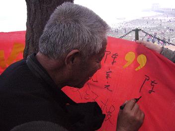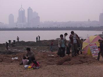 4月21日,嘟嘟成人网 05级光信息科学与技术一班全体同学开展了“我为绿色奥运做点啥”活动,他们来到栈桥及其附近沙滩清理垃圾。并举行了“倡导绿色奥运 构建文明青岛”的签名活动。图为活动现场。
