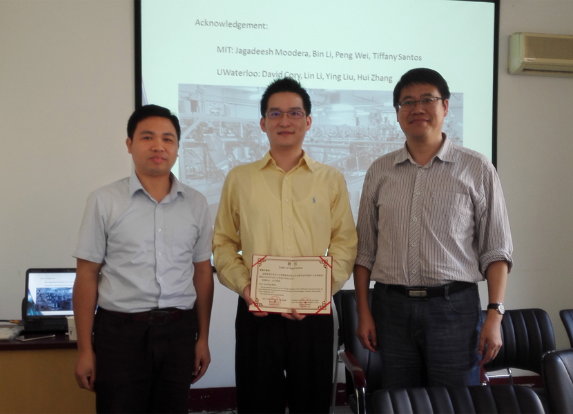 为师生作了题为“Exchange Induced Interfacial Field from Magnetic Insulators”的学术报告。报告讲解了自旋电子器件在信息存储处理芯片中的重要应用,介绍了其课题组利用磁性绝缘体产生自旋极化电流的最新研究进展,并系统阐述了各种磁性绝缘体与二维电子材料界面交换作用产生的奇异物理现象。报告结束后,学院龙云泽教授代表“低维纳米材料与光电器件协同创新中心”聘请苗国兴为中心客座教授,为其颁发聘书,希望双方建立密切联系,相互交流合作。