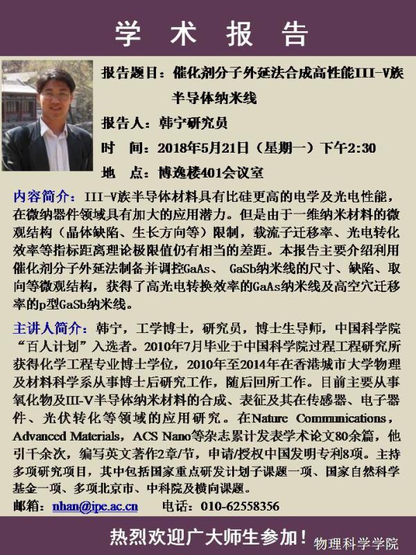 2018物理前沿学术报告第十六讲:催化剂分子外延法合成高性能III-V族半导体纳米线