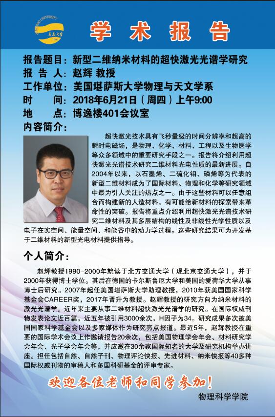 2018物理前沿学术报告第十九讲:新型二维纳米材料的超快激光光谱学研究