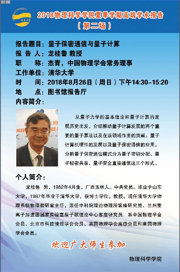 2018物理前沿学术报告第二十二讲:量子保密通信与量子计算