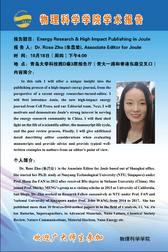 2018物理前沿学术报告第四十二讲:Energy Research & High Impact Publishing in Joule