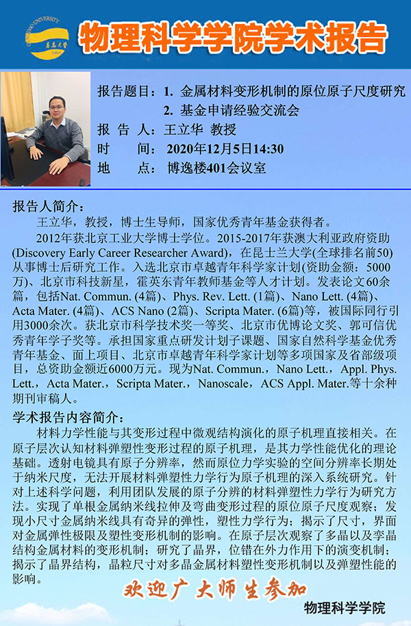 学术报告:金属材料变形机制的原位原子尺度研究