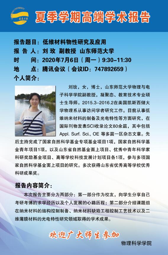 夏季学期高端学术报告:低维材料物性研究及应用