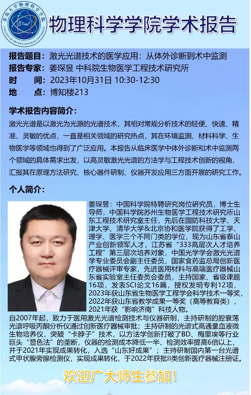 [学术预告]姜琛昱-激光光谱技术的医学应用:从体外诊断到术中监测