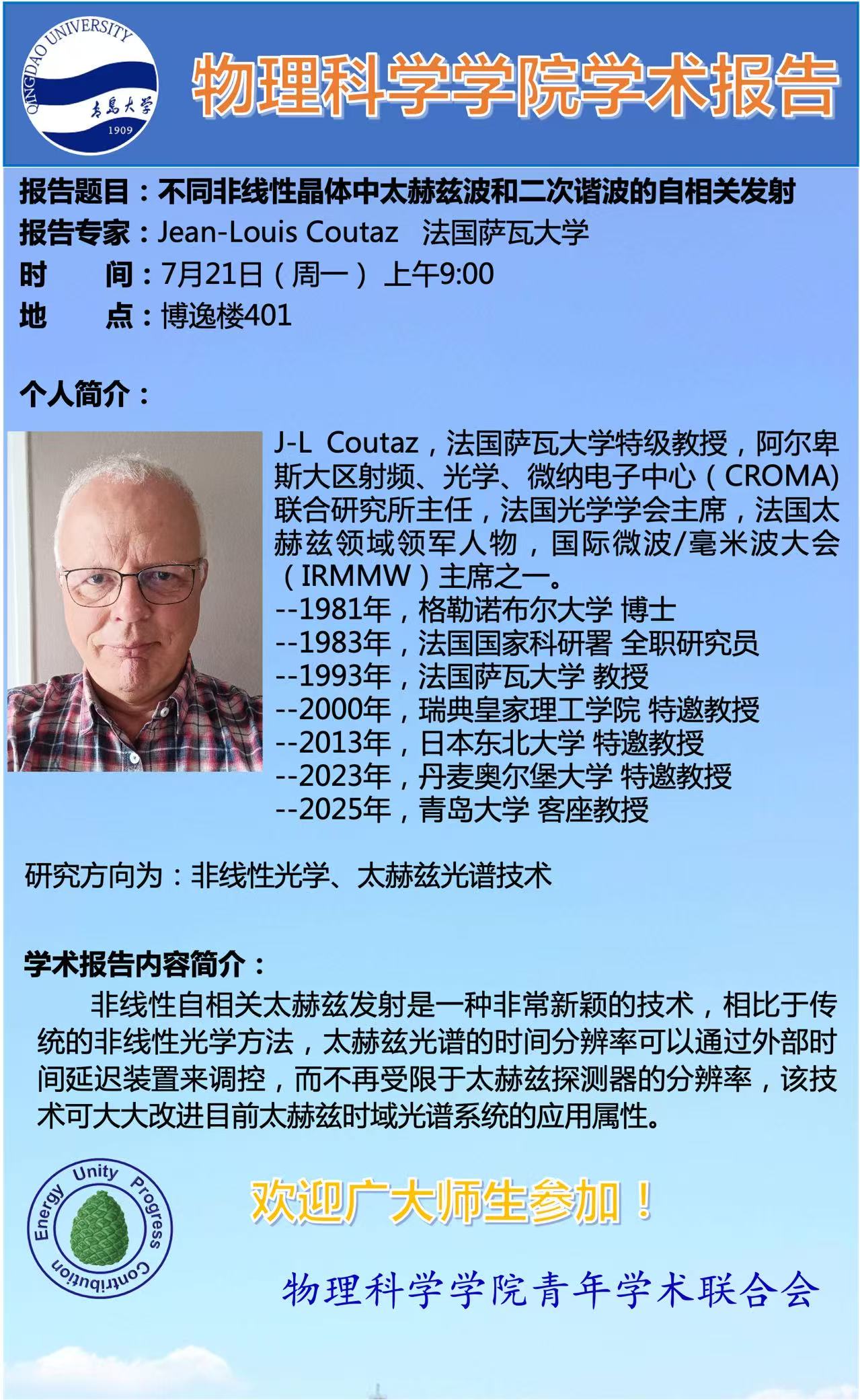 [学术预告]J-L Coutaz-不同非线性晶体中太赫兹波和二次谐波的自相关发射
