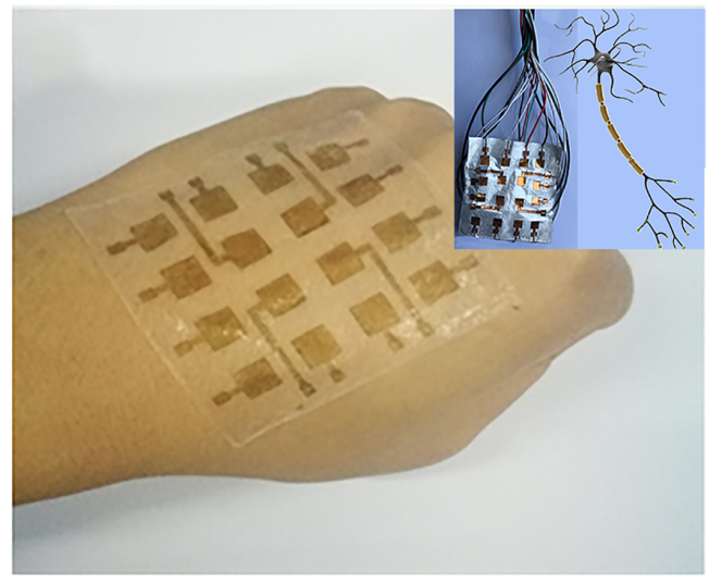 随着人工智能的快速发展,机器人的仿生研究成为热点研究课题,特别是用于压力、温度传感的电子皮肤。但是,对人类而言较为困难的数学逻辑等在人工智能领域较为容易实现,简单的触觉、视觉等对人类而言非常简单的感官知觉,在人工智能领域的实现则较为困难。因此本工作使用静电纺丝高分子PVDF纳米纤维的压电、热释电机制集成触觉和温度传感性能,实现仿生皮肤的基本功能。特别是通过合理设计双电容的电势对比,将复杂的传感器阵列双电极创新性地简化为单电极器件,从而极大地简化了电子皮肤的结构。