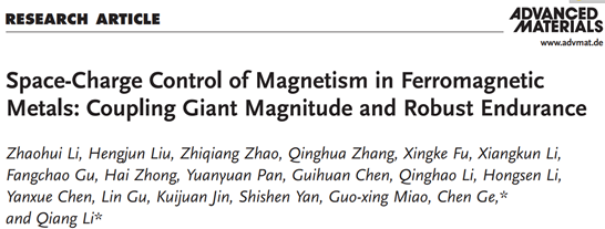 磁电耦合调控是发展低功耗、非易失、快速度、多功能自旋电子器件的关键,蕴含着丰富的物理内涵和巨大的应用前景。近日,嘟嘟成人网 李强教授课题组提出了一种全新的调控策略——空间电荷磁电耦合机制,为载流子相关的物性调控研究提供了一种新思路。相关研究成果以“Space-charge control of magnetism in ferromagnetic metals: coupling giant magnitude and robust endurance”为题,刊发在材料领域著名期刊Advanced Materials上。论文第一作者是嘟嘟成人网 2019届研究生李召辉(加拿大滑铁卢大学攻读博士学位)与2020届研究生刘恒均,嘟嘟成人网 李强教授与中科院物理所葛琛研究员为论文通讯作者,嘟嘟成人网 为第一通讯单位。