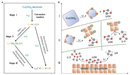 为了揭示这一关键科学问题,该工作对典型的Co(OH)2/Li电池体系进行了深入研究,并取得了重要进展。结合微观电镜、光谱分析、磁性测试和密度泛函理论计算阐明了Co基电极材料中涉及自旋极化电子转移的电化学界面催化反应全过程(上图),揭示了电化学驱动演化过程中的局部化学、电子结构,以及它们与电化学性能的联系。以Co(OH)2为模型电极,监测不同施加电压下的Co金属中心。结果发现在典型的界面催化反应进行之前,由于自旋极化电子的注入,金属Co纳米颗粒/LiOH界面处首先出现自旋极化表面电容并存储界面电荷。随后,金属Co纳米颗粒作为催化活化中心,会转移这些贮存的电子以促进LiOH分解。有趣的是,在LiOH分解电位下,反应过程中涉及电子的转移导致金属Co纳米粒子的电子结构呈现出周期性动态变化。这项工作提供了一种可行的方法来获取界面催化过程中的关键信息,并为监测更广泛电化学系统中的复杂界面提供了有力的工具。此外通过建立电极动态结构演变与电化学性能之间的联系来帮助优化界面催化剂,可以为构建下一代能源系统开辟一条新的途径。