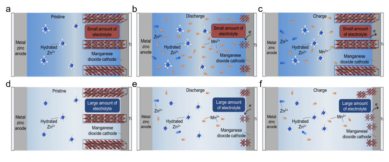 为了进一步揭示Zn-MnO2电池在弱酸性电解质中的储能机理,这项工作通过耦合传统扣式电池和定制的烧杯电池,开发了一种新的方法,以精确识别Zn-MnO2电池的储能机制。该方法直观地模拟了不同场景下电池的运行状态,可以全面研究弱酸性条件下Zn-MnO2电池的运行机理(如上图所示)。实验结果表明,控制Mn2+在电解液中的加入可以调节电池的电化学性能。同时,利用该方法能够系统地排除Zn2+和/或H+嵌入/脱出反应的可能性,从而确认了MnO2/Mn2+溶解-沉积机制的主导地位。此外,结合一系列的相和光谱表征,该工作还探讨了电池循环过程中电极和电解质的组成、形态和结构演变,阐明了Zn-MnO2电池在弱酸性电解质中的储能化学特性。该方法亦可以推广到其他储能系统,为准确识别水系铝离子电池的储能机理提供一种通用的方法。