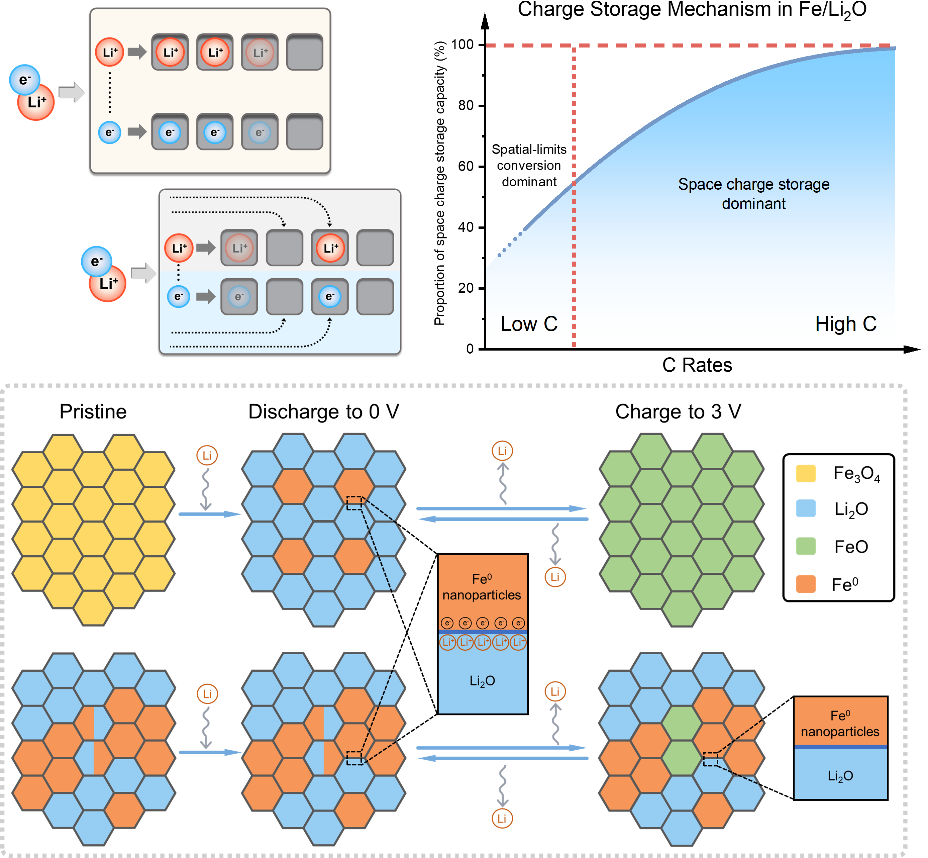 的重点。但通常为了实现高倍率的充放电性能往往伴随着电池能量密度的牺牲。在这项工作中,研究人员基于空间电荷存储机制,成功构建系列电子导体/离子导体电极材料(Fe/LixM (M=O, F, S, N)),同时兼具高能量密度、高倍率性能和高循环稳定性。通过热力学拟合结合磁学测试,提出了人工电子/离子导体电极材料的Li插入优势机制调控原则,并建立了相应机制模型。这项研究创造了一种可行的方法,将卓越的空间电荷存储机制引入到了快充电极材料的设计中,可以弥合当前电极材料与未来电池应用日益增长的要求之间的性能差距矛盾,同时证明了空间电荷存储在下一代超快充电储能系统中的潜在可行性。