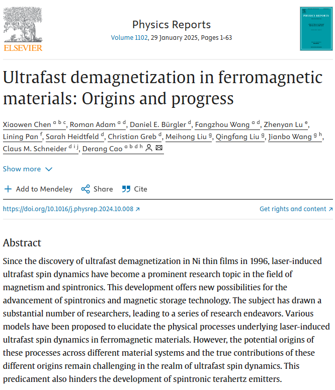 曹德让课题组应邀在物理学顶尖期刊《Physics Reports》上发表题为《Ultrafast demagnetization in ferromagnetic materials: Origins and progress》(Physics Reports 1102 (2025) 1–63)的长篇综述文章。嘟嘟成人网