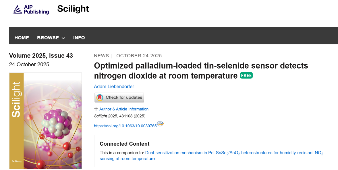 张军教授团队发表题为“Dual-sensitization mechanism in Pd-SnSe2/SnO2 heterostructures for humidity-resistant NO2 sensing at room temperature”的研究论文。该研究成果受到美国物理学联合会“科学之光”(Scilight)专题采访报道。