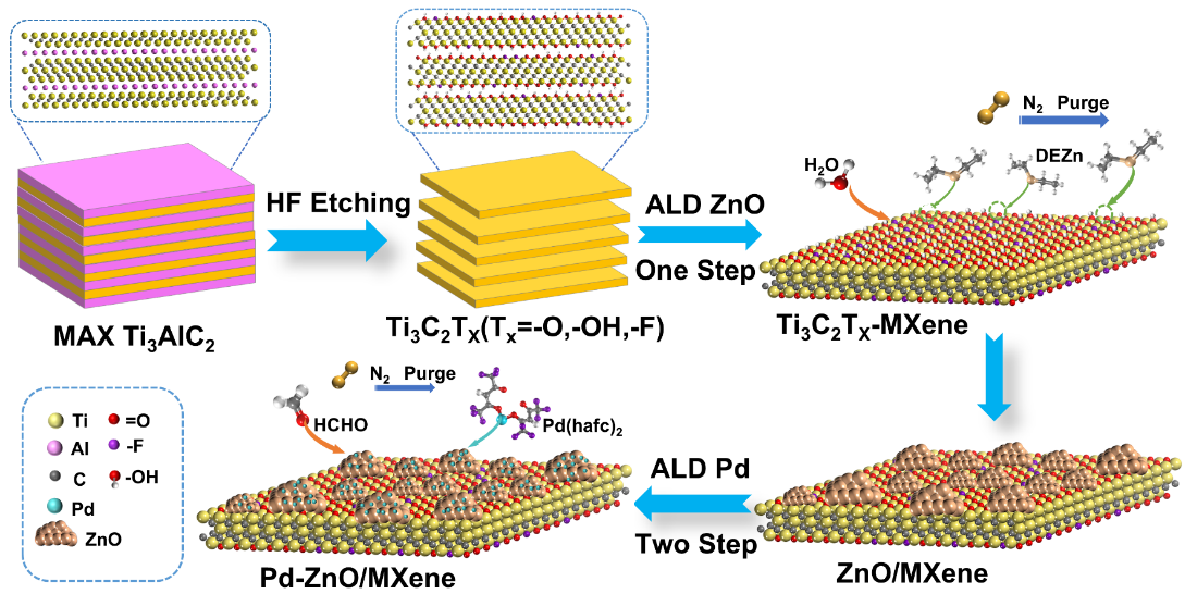 MXene作为一种新型二维材料,凭借高导电性、丰富的表面官能团与可调控的表面化学性质,在微纳电子器件和气体传感领域展现出巨大潜力。然而,其表面金属原子在环境条件下的快速氧化,导致材料性能衰减,成为制约实际应用的瓶颈。为解决这一难题,团队基于原子层沉积(ALD)技术开发了表面工程策略,在Ti₃C₂Tₓ MXene表面精准构建ZnO与Pd共修饰敏感界面。该“导电基底-氧化保护-催化修饰”三元协同结构,有效抑制了材料氧化并提升了氢气反应活性。基于该策略制备的Pd-ZnO/MXene传感器对50 ppm H₂的响应/恢复时间仅为23秒/64秒,表现出高灵敏、快速和稳定的检测性能,为“双碳”背景下的氢能“制-储-运-用”全链条安全监测提供了可靠的传感解决方案。此外,该ALD表面工程策略具良好普适性,有望拓展至其他MXene体系乃至二维材料器件应用,为高性能电子器件的构建提供了新范式。该成果以“Atomic Surface Engineering of MXene for Stable Hydrogen Sensing at Low Temperature”为题,发表于纳米材料领域顶级期刊Small(IF=12.1),2023级硕士研究生杨潇为第一作者,刘相红教授与张军教授为共同通讯作者。