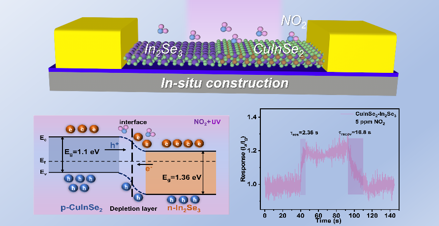 针对传统过渡金属硫族化合物(TMD)异质结制备中存在的转移损伤与界面退化问题,团队创新提出“直接原位固相转化”策略,一步构筑片上集成式二维CuInSe₂–In₂Se₃异质结,避免了机械转移过程,显著提升了器件的一致性。该异质结在365 nm紫外光激发下具备自驱动运行能力,在室温下对5 ppm NO₂表现出高选择性与超快响应(2.36秒),灵敏度达到国际先进水平,为面向物联网的低功耗、高性能气体传感器提供了新路径。该研究成果以“In situ construction of CuInSe2–In2Se3 heterojunctions for highly selective self-powered NO2 sensors”为题,发表在物理学领域的自然指数期刊Appl. Phy. Lett.,并被遴选为“Editor's Pick”。 2023级硕士研究生姜浩为第一作者,郑威副教授与张军教授为共同通讯作者。