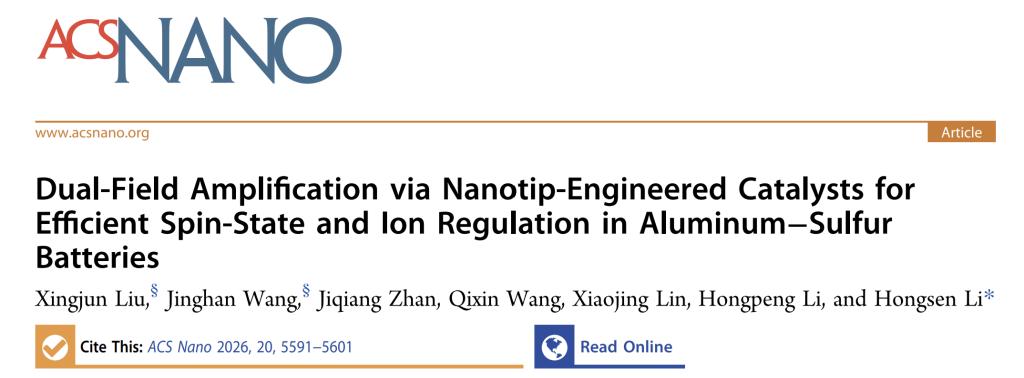 李洪森教授课题组在研究外磁场调节自旋态协同尖端效应催化铝硫电池取得重要研究进展。相关原创性研究成果以《Dual-Field Amplification via Nanotip-Engineered Catalysts for Efficient Spin-State and Ion Regulation in Aluminum-Sulfur Batteries》为题在国际顶级学术期刊《ACS Nano》在线发表。硕士研究生刘星君为论文的第一作者,李洪森教授为通讯作者,嘟嘟成人网
