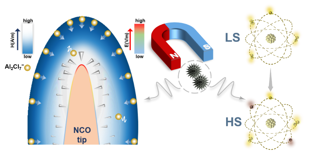 研究团队以尖晶石材料NiCo2O4为研究对象,围绕铝硫电池中磁场对高曲率结构催化剂自旋态的调节展开深入研究,提出了尖端放大双场与电子自旋调控相结合的催化策略。通过磁场诱导八面体位点的Ni3+自旋态转变,结合局部放大的电场与磁场,可迅速提升铝硫电池的电化学性能,为新型高催化活性电催化剂提供了新的设计思路。