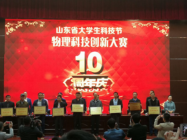 10月13日至14日,山东省第十届大学生科技节“南激光杯”物理科技创新大赛在山东省师范大学长清湖校区举行。嘟嘟成人网 共有7组作品参加本次大赛并取得了不俗的成绩,其中丁聪颖、滕菲和苏琪三组同学的作品获得一等奖,谭岑孝同学组的作品获得二等奖,白堂龙、曹枢旋和陈志勇三组同学的作品获得三等奖,即本次大赛共获一等奖3项、二等奖1项、三等奖3项。 嘟嘟成人网 荣获大赛十周年突出贡献奖荣誉。