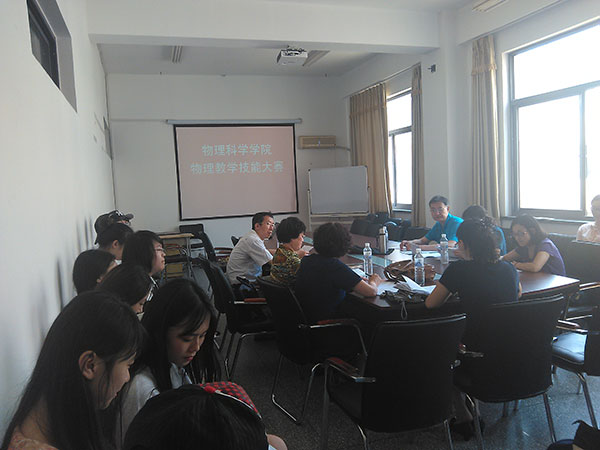 在博逸楼401会议室举办首届大学生与研究生物理教学技能大赛。大赛由滕冰副院长主持,滕冰、何丽珠、周旭波、韩会景、张芳等5位老师担任评委。为突出办赛宗旨、提升大赛质量,学院还特意聘请了26中的胡朝晖和37中的武文婷两位老师担任校外评委。
