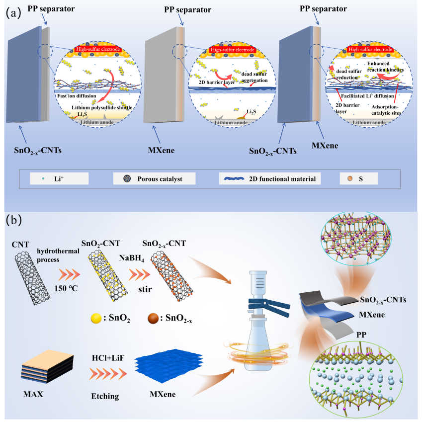 该研究主要针对高能量密度锂硫电池存在的多硫化物穿梭效应和硫氧化还原动力学缓慢的问题,提出了一种新颖的双梯度隔膜功能化设计策略,利用富含氧空位的一维SnO2-x修饰碳纳米管(SnO2-x-CNTs)作为上层催化/吸附层和二维MXene(Ti3C2)作为下层物理屏障层,通过二者协同,精准调控LiPSs的反应界面。氧化锡空位的生成使Sn的p带中心向费米能级移动,从而实现LiPSs的吸附-捕获-转化过程,提高锂硫电池的循环稳定性和倍率特性。