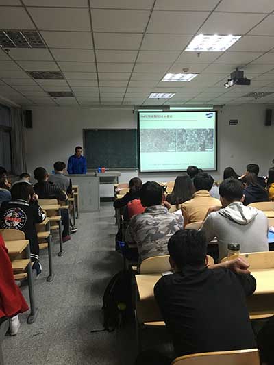 2014级研究生冯红磊在浩园307教师作了题为“金属氧化物纳米材料的制备、微观结构及其物理化学性能研究”的学术报告。学院2016级全体研究生共50余人参加了报告会。报告会由学院副院长滕冰教授主持。