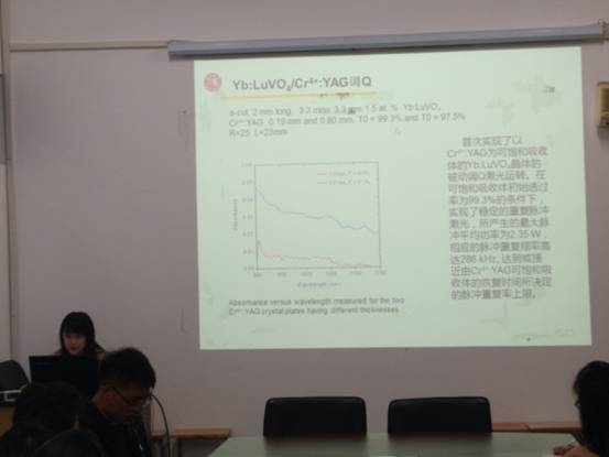 2016级研究生窦晓丹在博逸楼401会议室作了题为《Yb:LuVO4与Yb:LuPO4激光晶体的研究》的学术报告。学院2017级全体研究生参加了学术报告。报告会由胡琛老师主持。