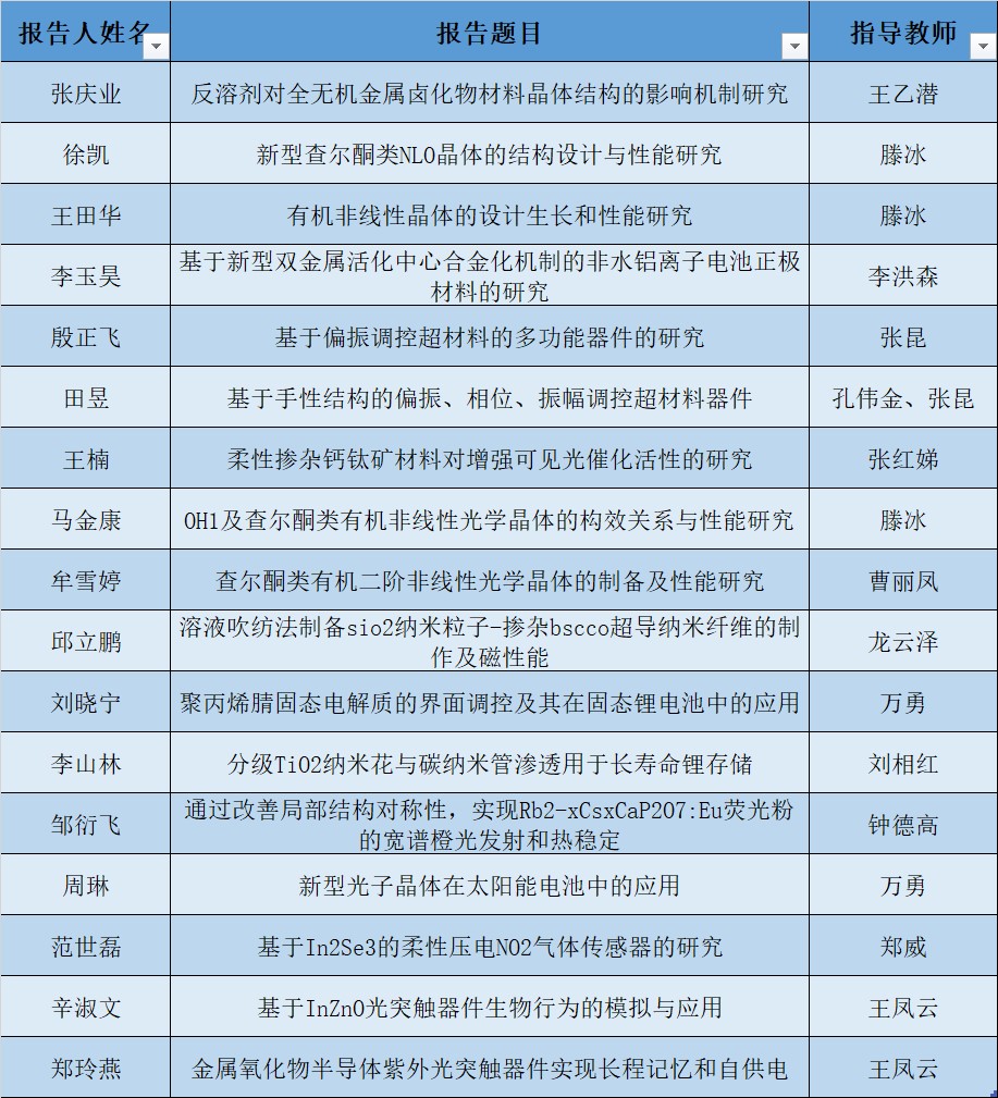 经过评委评审,推荐周立浩、王昱晓、于雅慧、赵志强、梁琦、杜岩峰同学获校优秀学术报告奖,推荐邹衍飞、徐凯同学获校优秀海报奖。