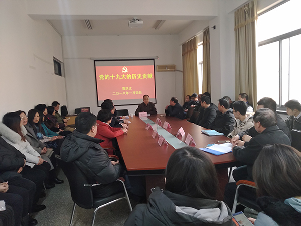 在博逸楼401会议室召开全体教职工会议,校党委常委、校纪委书记贾洪江为学院全体老师作了题为《党的十九大的历史贡献》的十九大精神学习辅导报告。会议由院党委书记黄国俊主持。