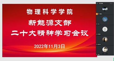 新能源科学与工程系党支部通过腾讯会议举行党的二十大精神学习会,对党的二十大报告进行了深入学习。党支部希望通过党的二十大精神学习,建设一支有活力、战斗力的党支部,并充分发挥自身引领作用,以“严真细实快”的工作作风,推动支部又好又快发展。