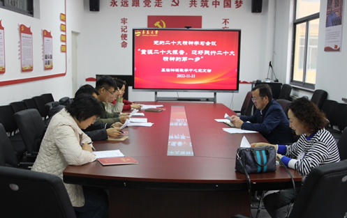 郝伟从学习党的二十大精神的感想、党的二十大报告中的新概念新名称以及学院基层党建工作思路与方案等三个方面,向支部全体党员进行了二十大精神的宣讲。希望每一位党员同志能够坚持以新时代中国特色社会主义思想为指导,深入学习和贯彻党的二十大精神和党的教育方针,坚决落实立德树人根本任务,为党和国家培养德智体美劳全面发展的社会主义建设者和接班人。