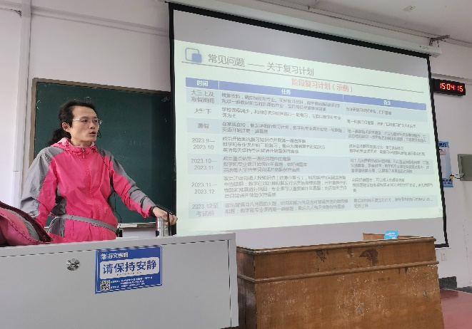 光电信息科学与工程系党支部书记刘眉洁从专业历年考研报录比、录取院校和专业等方面出发,鼓励同学们要合理安排考研复习时间、制定可行的学习计划,要劳逸结合,备考的同时动态关注考研相关信息。同时,她勉励同学们要坚定理想信念,笃定目标、不负时代、不负韶华。
