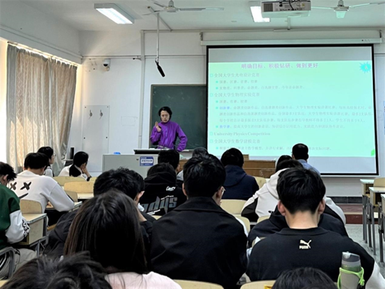 光电信息科学与工程系党支部书记刘眉洁老师为大家详细介绍了A类、B类竞赛以及其重要性,鼓励同学们坚定信心目标,合理规划自己的学习和生活以及竞赛占比,鼓励大家明确目标、积极钻研、做到更好。
