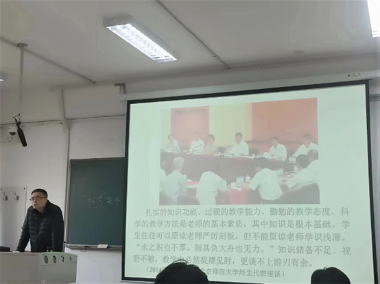 物理教育系贺明明老师结合班级情况,以高质量教育与高素质人才为主题,从师范专业的角度,强调了就业形势严峻的现状与就业政策的变化,引导同学们认识到高质量的教育需要高素质的教师,同时要从自身的职业发展出发,从基础学科特点出发,激发内在学习动力,提升个人综合能力。接着他强调了高素质教师需要进一步提升学历,需要不断地学习,并引导同学们在以后的工作中要做新时代“四有”好老师;最后,他从考研的角度鼓励同学们坚定考研决心,提前做好规划,努力成为堪当民族复兴重任的时代新人。