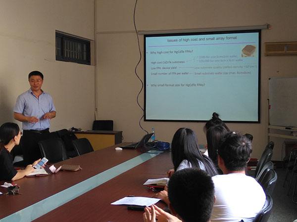报告中,雷文教授介绍了红外探测技术的优点及其在国防、军事、天文、医疗等方面的应用,重点介绍了HgCdTe红外探测器的制备及其优缺点,包括GaSb复合衬底的优势、过渡缓冲层制备出可用于生产长波红外的材料等,并根据其工作温度低的缺点提出了一些抑制高温暗电流噪音的方法。此外,雷文教授还介绍了使用MEMS光学滤波器制备自适应红外焦平面从而进行多色红外成像的原理。报告结束后,他就师生们提出的Sb化物制备红外探测器的可行性、MEMS光学滤波器的工作温度以及为什么不直接用滤波片代替MEMS光学滤波器等问题做了详细解答,并对研究生以后的科研工作提出了意见。
