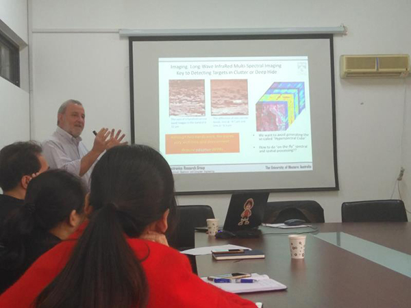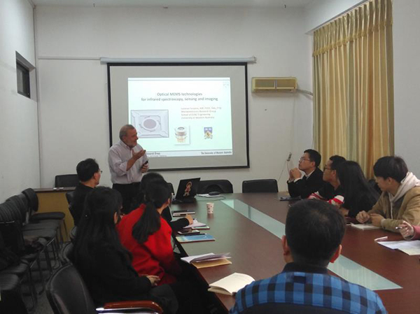 Faraone首先简要介绍了澳大利亚西澳地区的自然景观、风土人情,西澳大利亚大学的基本情况和自己的研究方向,着重阐述了红外光谱技术在国防安全、生物医学、食品安全等方面的应用,详细剖析了光学Micro Electro Mechanical Systems(MEMS)的结构设计、工作原理以及遥感、成像等红外光谱技术,并阐释了该领域的未来发展方向和亟待解决的问题。报告结束后,Faraone教授就师生们提出的远红外成像质量与波长和强度的关系、MEMS系统与FPA的关系以及MEMS是否可以进行硅光集成等问题作了解答,并对新入学的研究生未来的科研工作提出了建议。