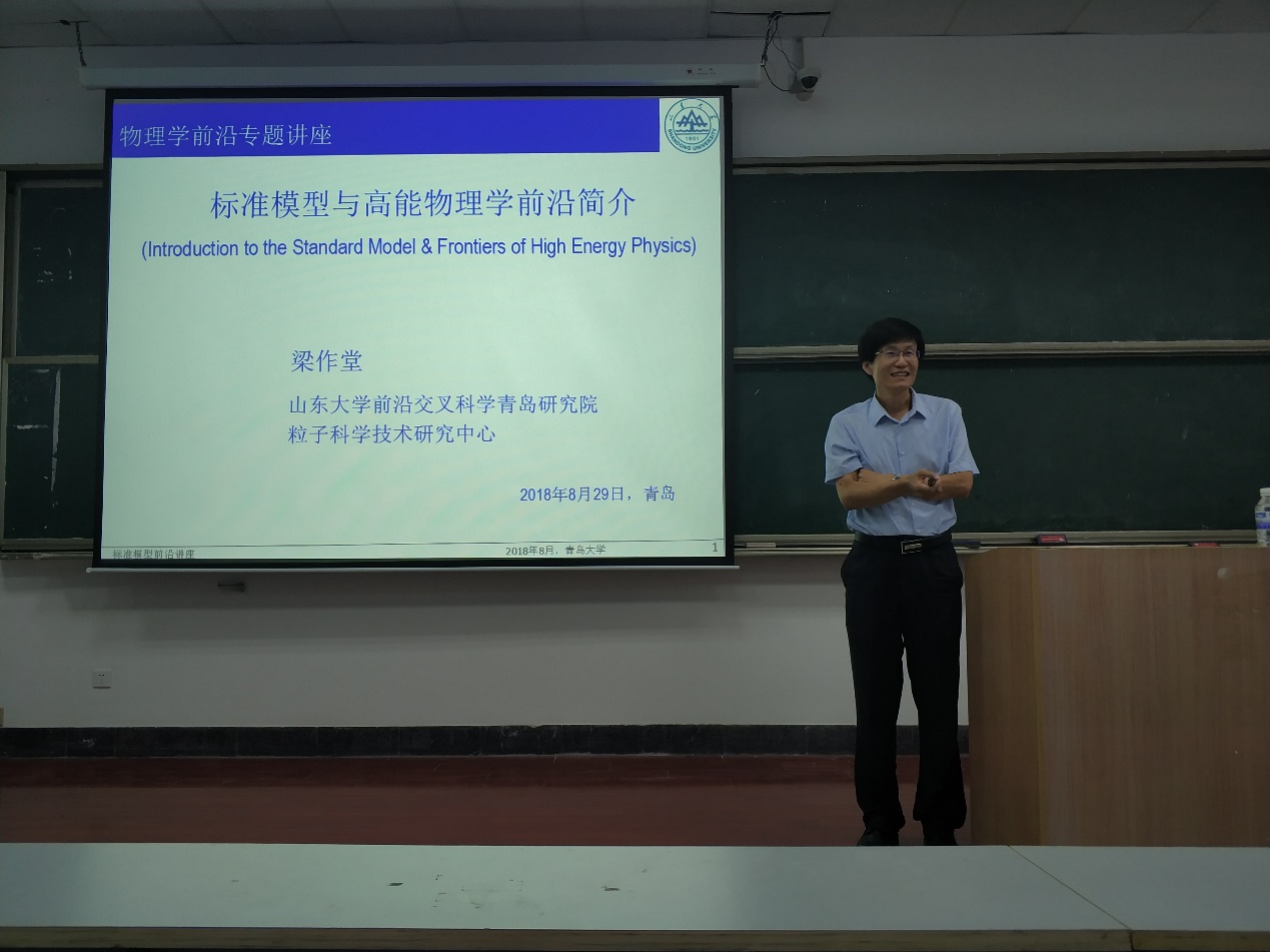 梁作堂以粒子物理标准模型理论基础、高能物理前沿概况、科研工作为主线,循序渐进地展开了报告。梁作堂首先介绍了物质结构及其之间的相互作用,分析了强相互作用、弱相互作用、电磁相互作用与万有引力等。随后介绍了固有的粒子的传统分类,将粒子分为强子与轻子,并强调了他们之间的区别。梁教授还介绍了强子结构、物质形态等方面的前沿研究进展,解释了强子中的核子结构之谜:质子半径之谜、质子自旋之谜、质子质量之谜、质子寿命之谜,还讲解了物质形态形成的原因、粒子碰撞试验等内容。最后,梁作堂欢迎同学们报考山东大学研究生。
