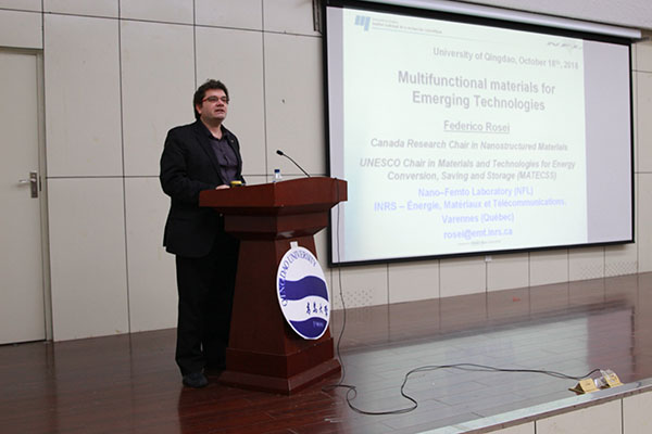 Federico Rosei院士首先结合自己多年的研究成果,通过翔实的数据和材料,介绍了多功能材料在太阳能光伏中的应用。Federico Rosei院士结合自己的成长之路,围绕研究生的科研成长,阐明了如何从一名研究生成长为一名有创新思维的科研人员。报告会上,研究生们就在科研中遇到的一些问题和困惑与Rosei院士进行了亲切友好的交流。