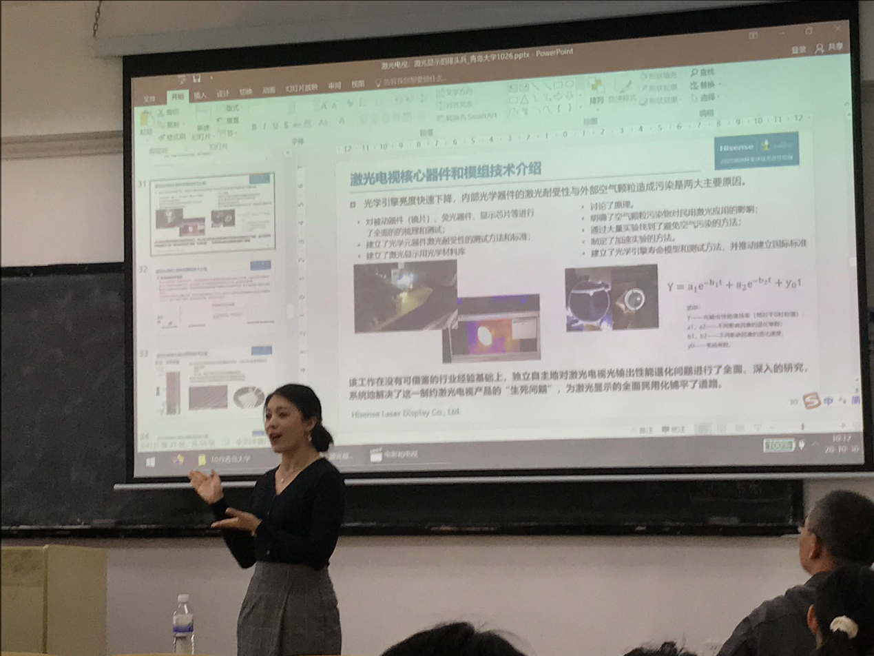 邀请海信集团激光显示公司副总经理,首席科学家刘显荣博士在博学楼302教室为师生作了题为《激光电视:激光显示的排头兵》的学术报告。报告会由院长滕冰主持,师生近100人聆听报告。海信科学探索中心杨雪馆长参加报告会和座谈交流,对进一步加强双方交流合作提出了宝贵建议。