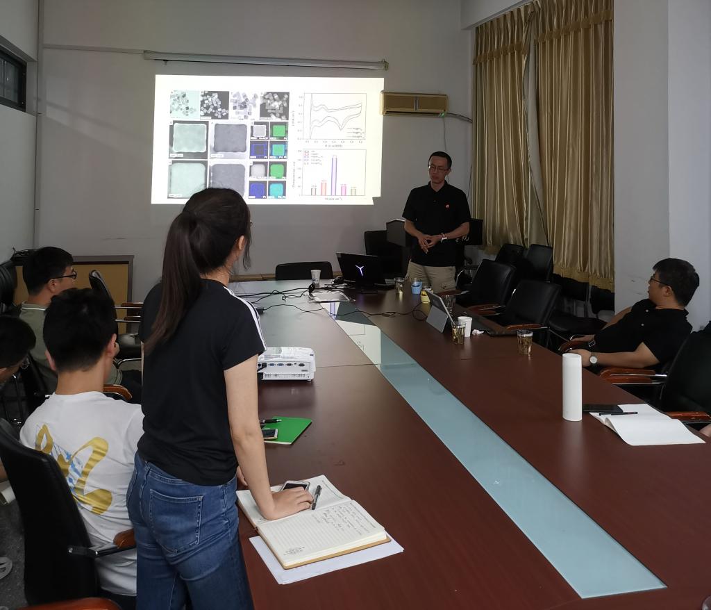 胡适从其前期实施的超细纳米颗粒、二维超细纳米带等工作讲起引出目前进行的重点性课题-液态金属界面的二维材料研究。胡适从《Science》杂志的一篇关于二维金属氧化物制备的工作中引发思考,通过探索含不同官能团的极性溶剂,自下而上地制备了不同的液态金属二维材料,并对其性能进行了相关表征及测试。胡适表示接下来会以熔融盐作为新型极性溶剂,进一步改善气泡在溶剂中的扰动,提高体系稳定性,从而合成更高质量的二维材料。报告会后,老师同学们也针对性地提出了各自的困惑,胡适一一耐心解答。在问到胡适教授转换科研方向的问题时,他表示,转换研究方向并不是一件容易的事,但是要勇于挑战,敢于探索,更重要的是要兼具吃苦耐劳的精神。