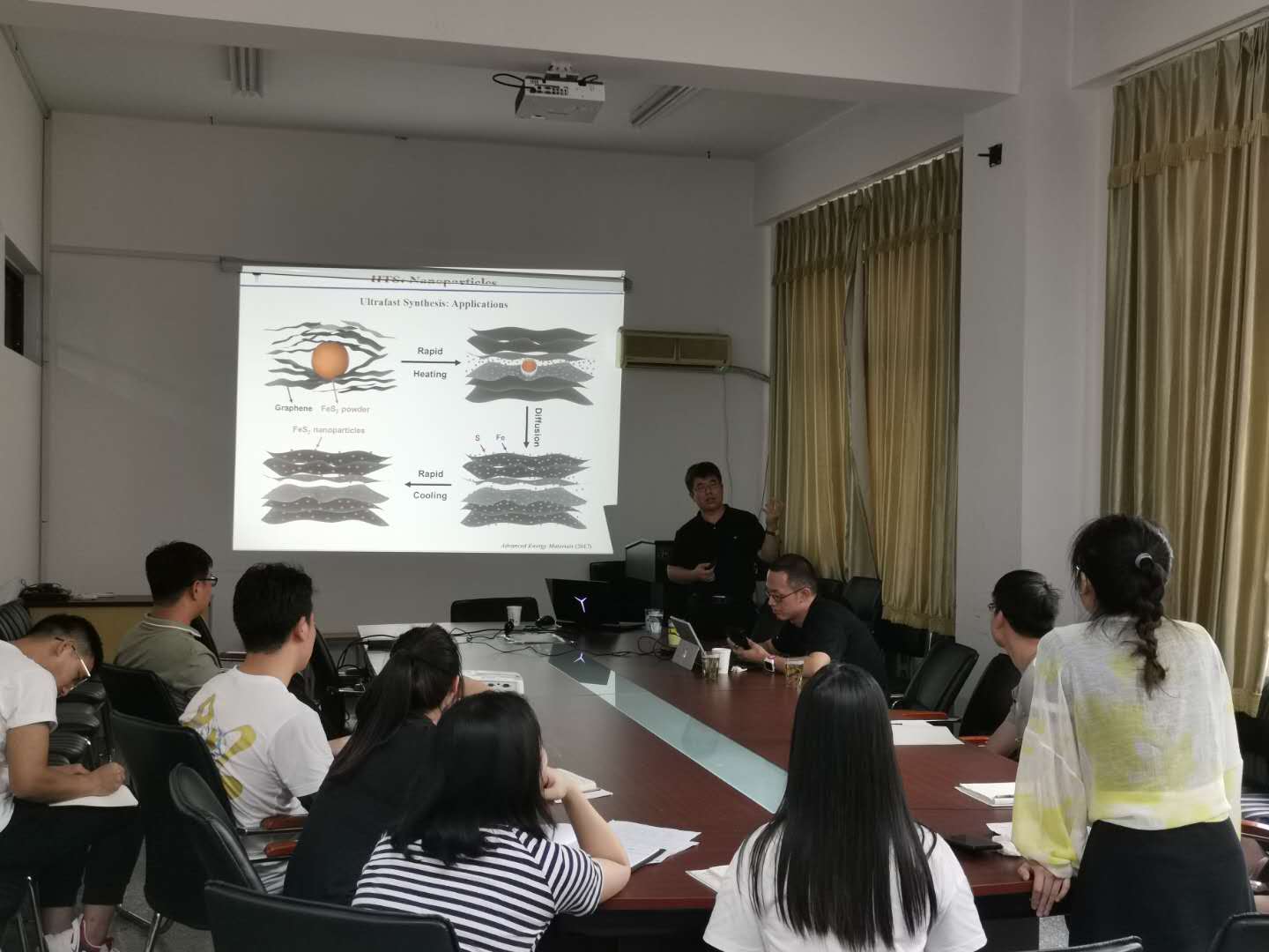 报告中,陈亚楠从High Temperature Technology(高温技术)、Cryo-EM(冷冻电镜)、Energy(能源)等方面详细介绍了所研究领域、典型性工作以及当前研究进展。其中,High Temperature Technology是一种新型纳米材料合成技术,可以在超短时间内合成小尺度纳米颗粒或纳米片等,同时可应用于超快、高质量石墨烯的合成。装置的搭建也相对简单且不受场地限制。课题组还在冷冻电镜样品制备困难的问题上取得了突破性研究进展,并利用其对材料的功能化表面和界面科学等作了深入探索。此外,陈亚楠就能源存储方向,如钾离子电池等体系所取得的研究成果作出了分享。报告结束后,同学们踊跃提问,内容包括纳米材料超快速合成方法、设备搭建以及所合成纳米颗粒的粒径控制等问题,陈亚楠都耐心作了解答。相关专业方向的同学和教师还就各自关心的读博问题和未来合作事宜与陈教授进行了讨论。