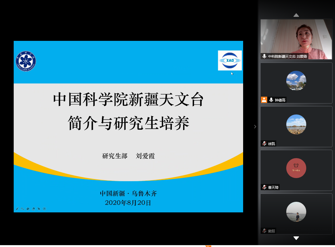 首先,刘爱霞对中国科学院新疆天文台近年来的建设和发展情况进行了介绍,包括人员结构、科研团队、监测站分布等,详细解读了新疆天文台的研究生招生专业设置、夏令营组织、本科生创新实验项目政策等,并就天文台的学习生活环境以及内部的硬件设施、招生人数和录取政策等一一作了介绍。