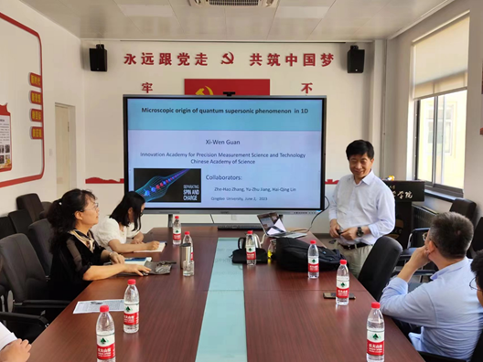 进行学术交流访问,并为师生作了题为《一维玻色液体中量子超声现象的物理起源》的学术报告。报告由物理学院邹鹏副教授主持。出席报告会的有院长滕冰教授、袁峰教授以及相关老师、部分本科生和研究生。