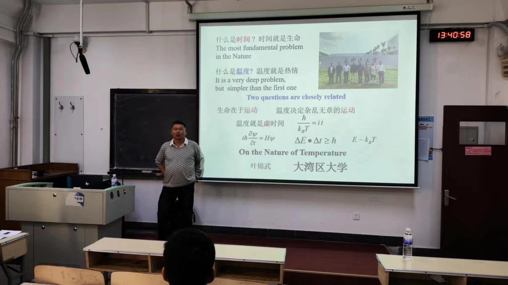 报告中,叶锦武讲解了温度的本质以及人们对温度在凝聚态物理、天体物理等不同领域中的理解和定义,介绍了在广义相对论背景下物理运动对温度的影响,为师生们打开了一座连接微观与宇观的“桥梁”。另外,他还介绍了物理学领域大家关心的问题以及这些问题,提出了物理学的“铁三角关系”,即量子计算、量子纠缠与熵概念的结合。会上,叶锦武同师生多次互动交流,气氛活跃。