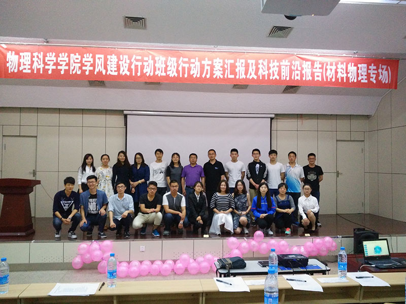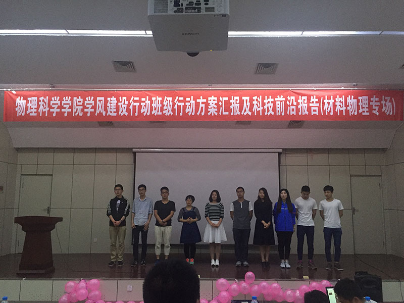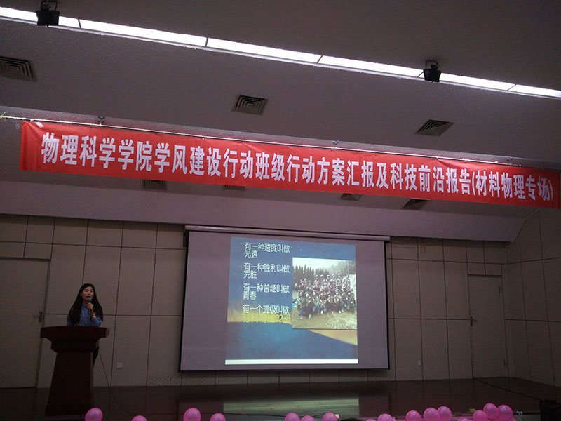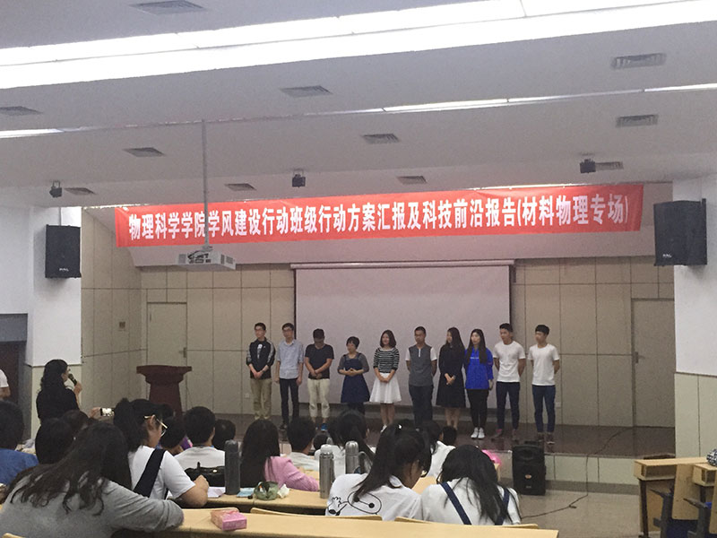 报告分上半场和下半场,上半场是班级学风建设行动汇报,专业老师就汇报内容提出问题,并提出意见和建议。下半场的专业科技前沿报告,各班自选主题,报告题目分别为:“先进陶瓷材料在生活中的应用”、“物理学风暴——神奇的‘超材料’”、”“一种前进广阔的材料——石墨烯”、“时代新秀——太赫兹”、“膜法传奇”,报告从选题到组织材料到制作PPT,同学们查阅了大量资料,对于其中的很多专业用词烂熟于心,报告集生动有趣与专业严谨为一体,又充分与材料物理的专业特色相结合,全场掌声此起彼伏。其中,又以2015级材料物理二班的黄娅的报告更为出彩,她和她的团队利用课余时间收集“膜”的相关知识,深入浅出的讲解了薄膜材料的原理、性能和应用、以及前景,脱稿讲解声情并茂,让枯燥的专业词汇变得灵动活泼,收获了全场师生的好评。
