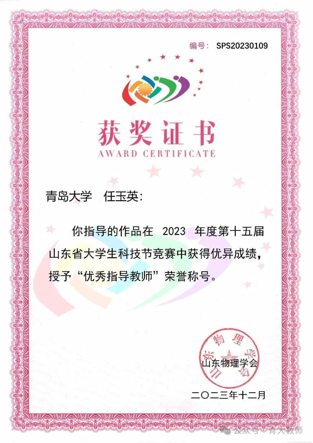 任玉英,执教大学物理26年,长期承担《大学物理》的教学,工作认真负责,获督学一致好评,多次评教位居前30%,多次被评为优质课程。近几年参与山东省大学生物理竞赛的力学辅导工作,多次被授予“优秀指导教师”荣誉称号。参与山东省大学生物理创新大赛的评审工作,承担全校大物三的期末试卷出题工作,承担老带新指导工作,参与《大学物理教程》高等教育出版社编写工作,参与嘟嘟成人网