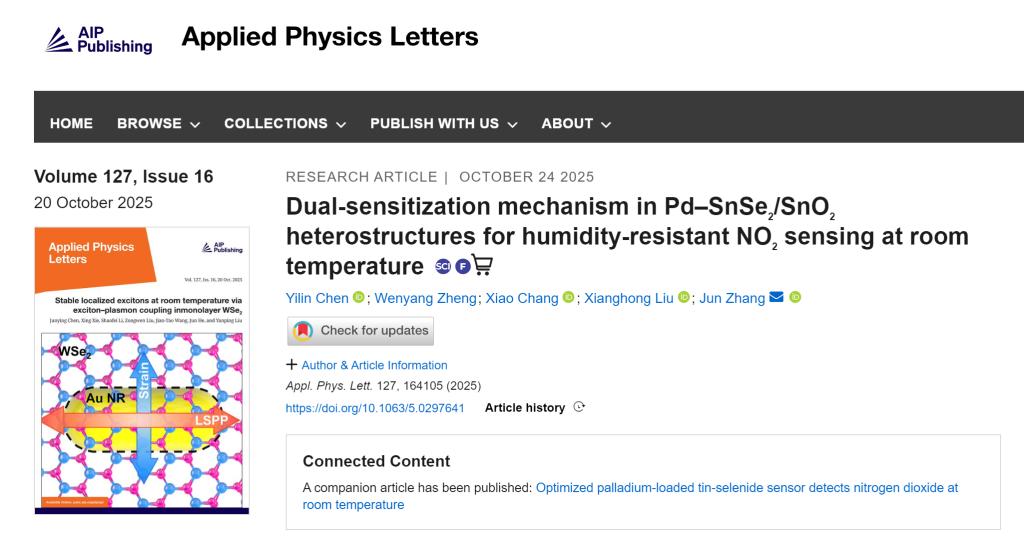 张军教授团队发表题为“Dual-sensitization mechanism in Pd-SnSe2/SnO2 heterostructures for humidity-resistant NO2 sensing at room temperature”的研究论文。该研究成果受到美国物理学联合会“科学之光”(Scilight)专题采访报道。
