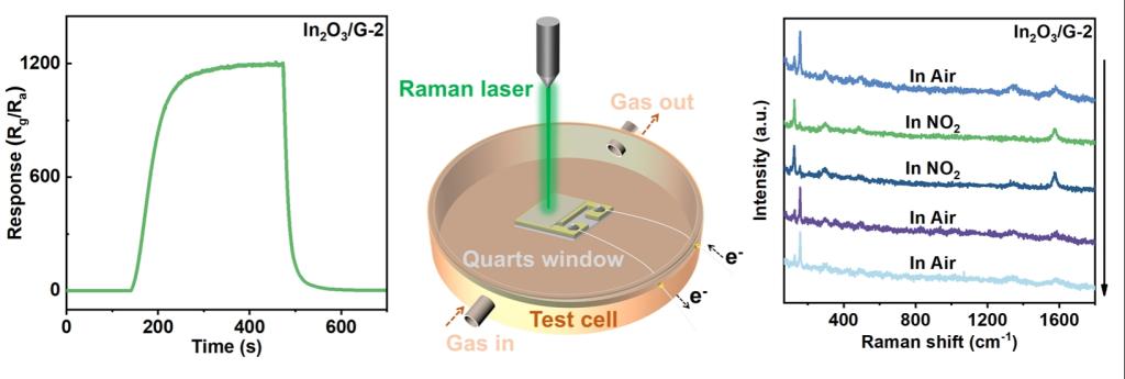针对半导体气体传感器敏感过程中活性物相不明、动态机理不清的核心挑战,团队利用石墨烯诱导成功制备了物相可调In₂O₃同质结构,并创新性地采用原位拉曼光谱技术,首次实现了对气体响应过程中材料表面物相动态变化的实时观测。该研究不仅使传感器对5 ppm NO₂的响应提升至1208,灵敏度提高20倍以上,更关键的是通过捕捉特征拉曼峰的可逆变化,明确了主导气敏行为的活性物相,建立起从纳米尺度结构动力学到宏观器件功能的直接关联,为高性能、低功耗气体传感器的理性设计提供了坚实的理论与实验基础。该成果以“Probing the Structural Dynamics of In2O3 Using in Situ Raman Spectroscopy: Bridging Material Dynamics and Sensor Functionality”为题发表于化学领域顶级期刊Angew. Chem. Int. Ed.。2023级博士研究生赵娜与常晓副教授为共同第一作者,刘相红教授和张军教授为共同通讯作者。