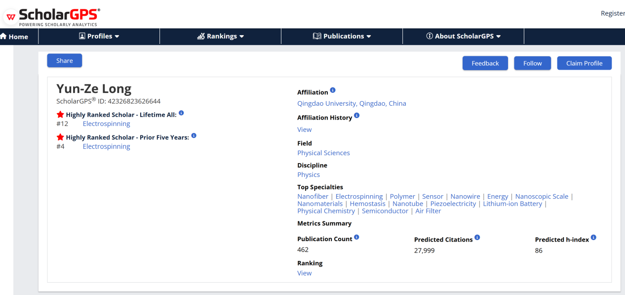 近日,国际学术评价机构 ScholarGPS发布了2025年全球学者排名,以“终身”为统计周期,嘟嘟成人网 龙云泽教授在“静电纺丝”领域全球排名第十二,以“过去五年”为统计周期,龙云泽教授在“静电纺丝”领域全球排名第四。该排名基于全球超过3000万学者和12000家科研机构的科研产出、学术影响力及引用质量进行量化分析,数据库覆盖2亿篇出版物和30亿次引用,是国际公认的完全量化学术排名体系。