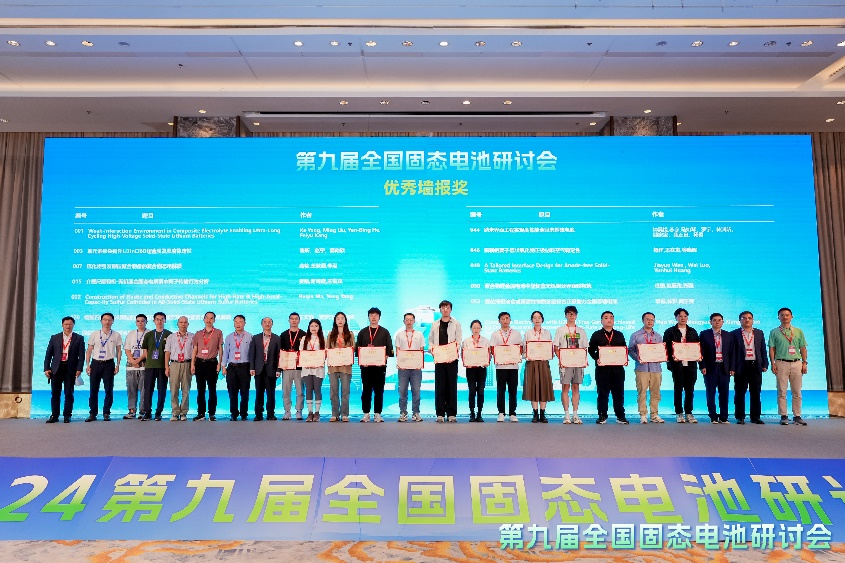 在能源科学领域的知名度。参加本次研讨会的还有团队中赵宁老师和部分研究生,其中陈昕同学的“氟元素掺杂提升Li3InCl6对锂金属及湿度稳定性”,王楠同学的“Composite Electrolytes with Li2CO3-Free Garnets Achieved by One-Step Poly(propylene carbonate) Treatment for High-Rate and Long-Life Solid Lithium Batteries”和王文静同学的“镶嵌石榴石纳米颗粒的多孔氮化碳微球实现高性能复合固态电解质”荣获优秀墙报奖。
